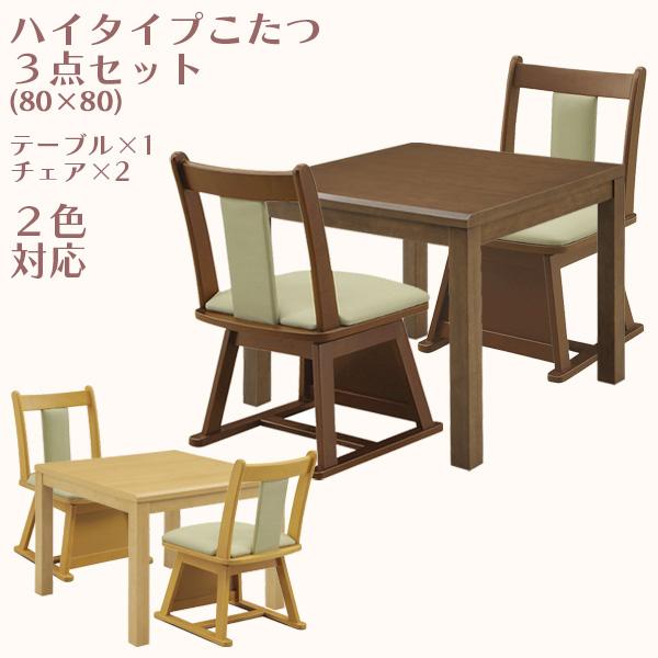 ダイニングこたつセット 二人用 2人用ハイタイプ楓80na イス2脚 肘掛 キャスター付 専用布団付