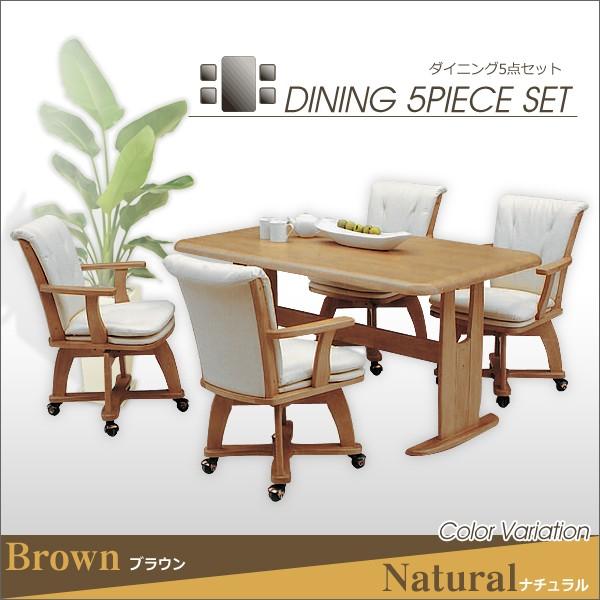 幅135 ダイニングテーブルセット 4人掛け 5点 角丸 回転チェア付き 木製 ブラウン