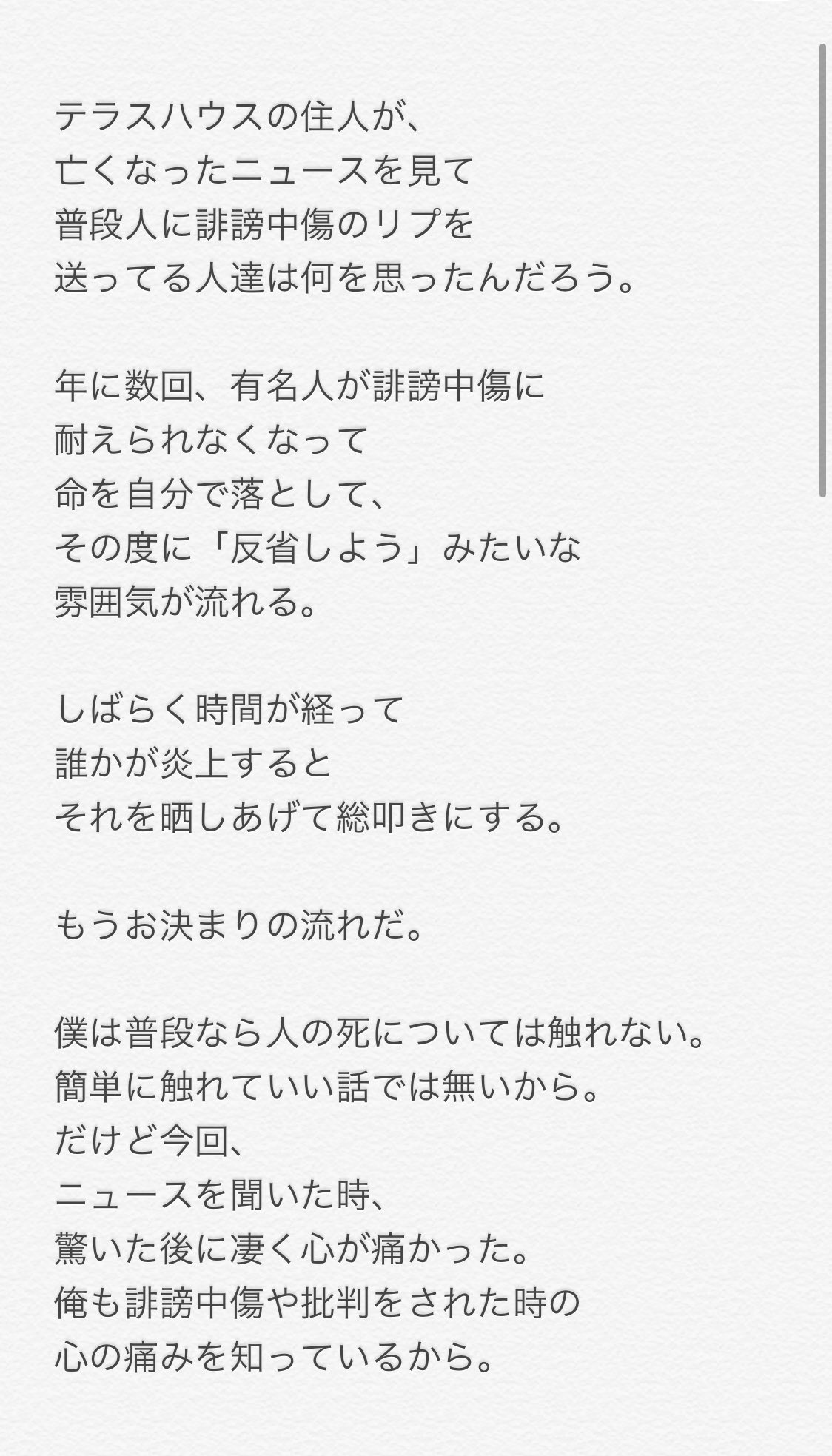ニャン on twitter 今回のテラスハウスのニュースを聞いて僕の意見を文章にしました 普段なら人 の死について話しません ただ どうしても伝えたくて書きました ここで亡くなった彼女に誹謗中傷した人を見つけて晒しあげては 負の連鎖 だと思います 読んで