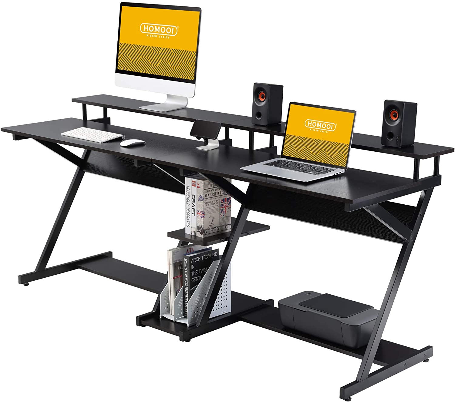 fitueyes パソコンデスク 2人用 二層収納棚付き ダブルpcデスク 机 ワークデスク 幅100 100cm ゲーブル管理 ラスティックブラウン cd120601mg