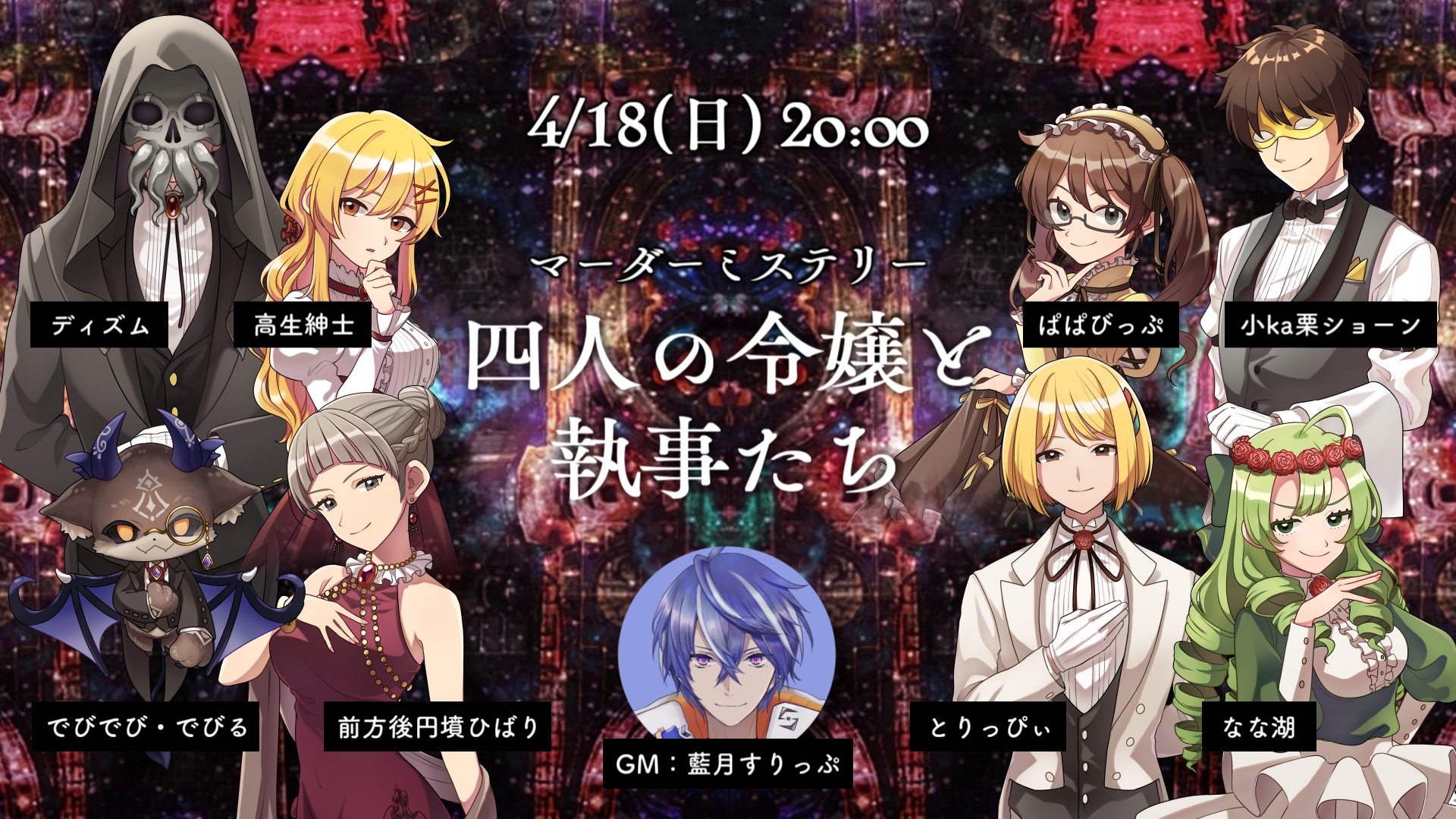 高生紳士 on twitter 配信告知 4月18日 日 20 00 マーダーミステリー 四人の令嬢と執事たち 企画 高生紳士 gm 藍月すりっぷ プレイヤー でびでび でびる 前方後円墳ひばり ぱぱびっぷ 小ka栗ショーン ディズム 高生紳士 とりっぴぃ なな湖