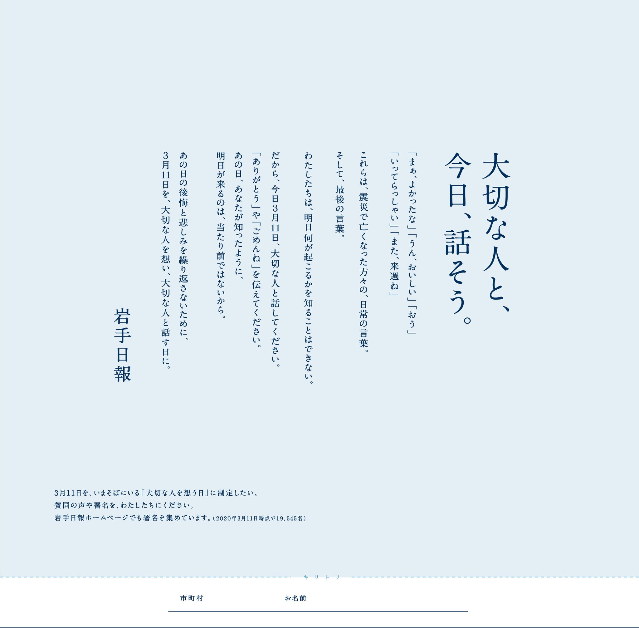 岩手日報 on twitter 大切な人と今日話そう きょうで東日本大震災から9年 うん おいしい はーい いってらっしゃい 震災で 亡くなった方の最後の言葉 3月11日を 大切な人を想い 大切な人と話す日に https t co dxpgb4lqs2 大切な人を想う日 最後