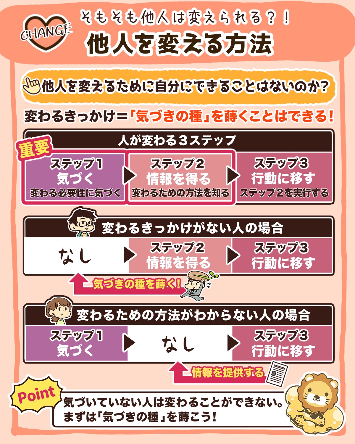 両 自由に生きるための知恵を配信中 リベ大学長 on twitter あの人 もっとこうなって欲しい って思う事あるやん 人が変わるには 気づく 方法を知る 行動する このステップが必要 必要としてない相手にいくら変わる方法だけ伝えても変わらん 他人を