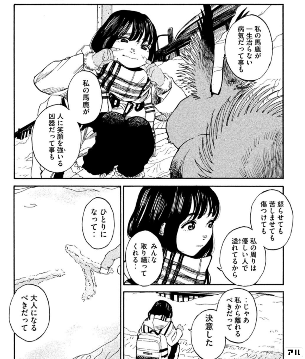 私の馬鹿が一生治らない病気だって事も 私の馬鹿が 人に笑顔を強いる凶器だって事も 怒らせても苦しませても傷つけても 私の周りは優しい人で溢れてるから みんな取り繕ってくれる じゃあ私から離れるべきだって決意した ひとりになって 大人になるべきだって ひとり