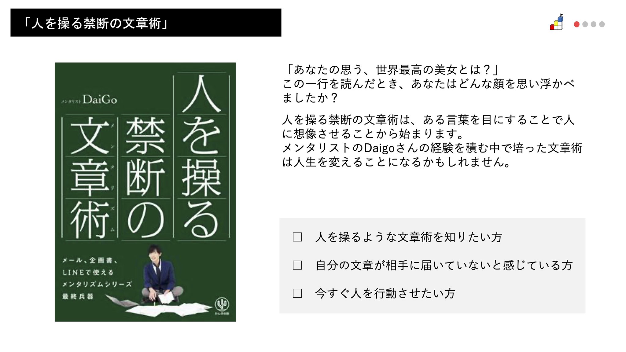 人を操る禁断の文章術 メンタリスト daigo著 をブログ初心者が読んでみた 遊び心満載