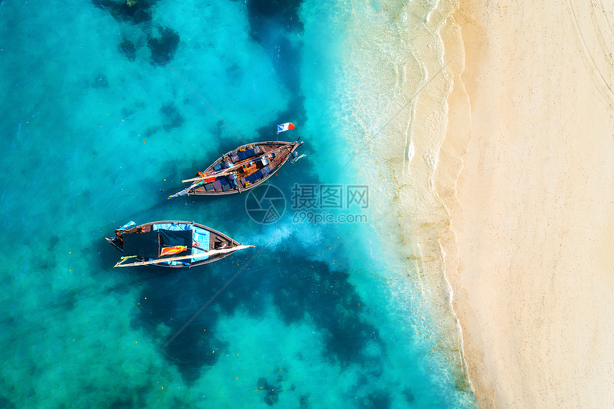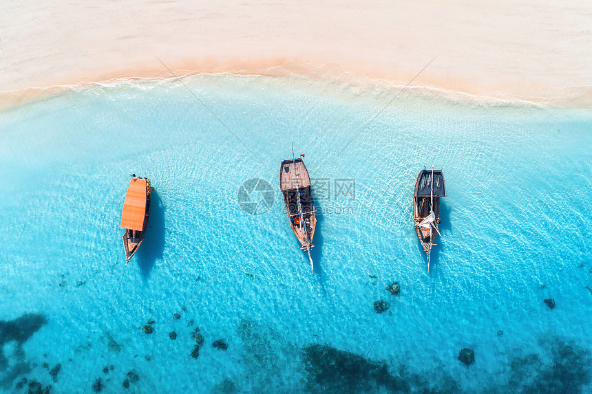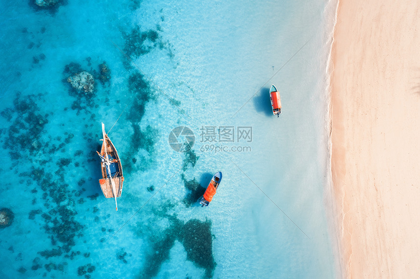 夏天的日落时 清澈的蓝色水中俯瞰渔船无人驾驶的船 沙滩上俯瞰印度洋非洲桑给巴尔旅行热带景观与帆船 海洋高清图片下载 正版图片300877443 摄图网