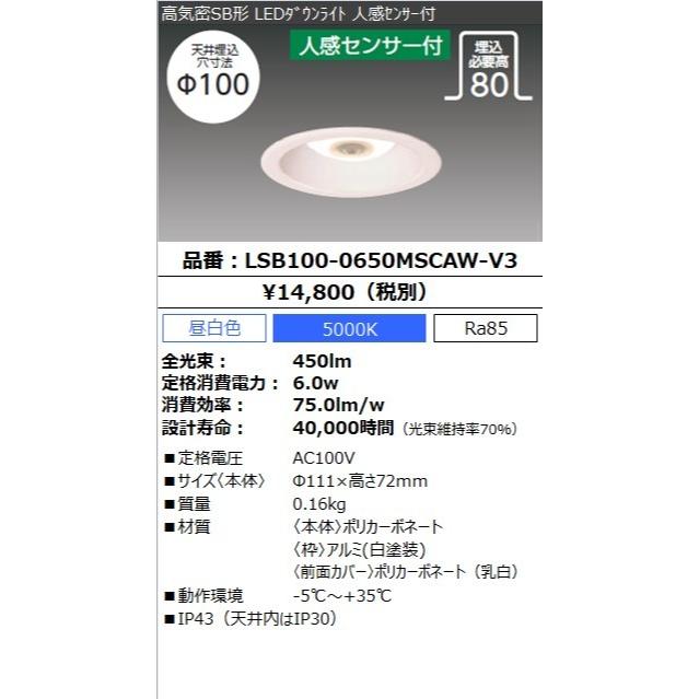 ダウンライト led 人感センサー 高気密sb形 lsb100 0650mscaw v3送料無料 ledダウンライト 昼白色 ledライト led照明 ライト ランプ ledランプ 照明 照明器具 住宅用 屋内 住宅照明 住宅照明器具 住宅向け 屋内照明 人感 新築 工事 法人向け