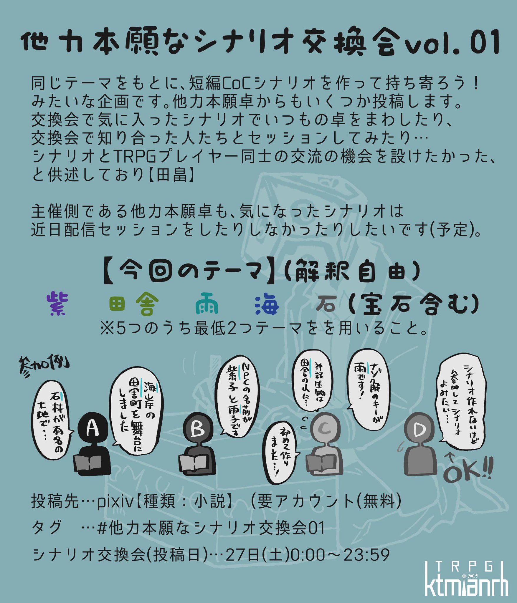 他力本願卓 クトゥルフ神話trpg on twitter シナリオ企画のお知らせ pixivでの企画として 以前の配信で呟いていた 同じテーマでシナリオを作り合って持ち寄る 的なやつを行います 交換会とは名ばかりで 実際は売買のないオンライン即売会みたいな感じです 交換会