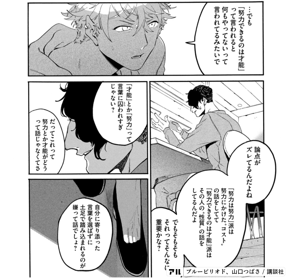 ppズレてるんだよね 努力できるのは才能 って言われると何もやってないって言われてるみたいで 努力は努力 派は努力にかけた コストの話をしてて 努力できるのは才能 派はその人の 性質 の話をしてるんだよでもそもそもそれってそんなに重要かな 才能 とか
