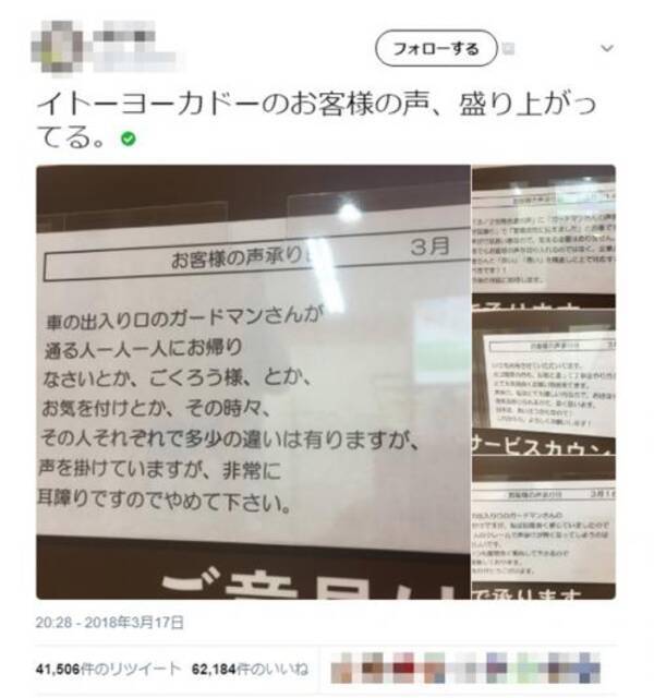 スーパーの お客様の声 で ガードマンが声かけしているのが耳障り との掲示に否定集まる twitter のリプライ状態 デジタルもアナログも人のやることは同じ 2018年3月19日 エキサイトニュース