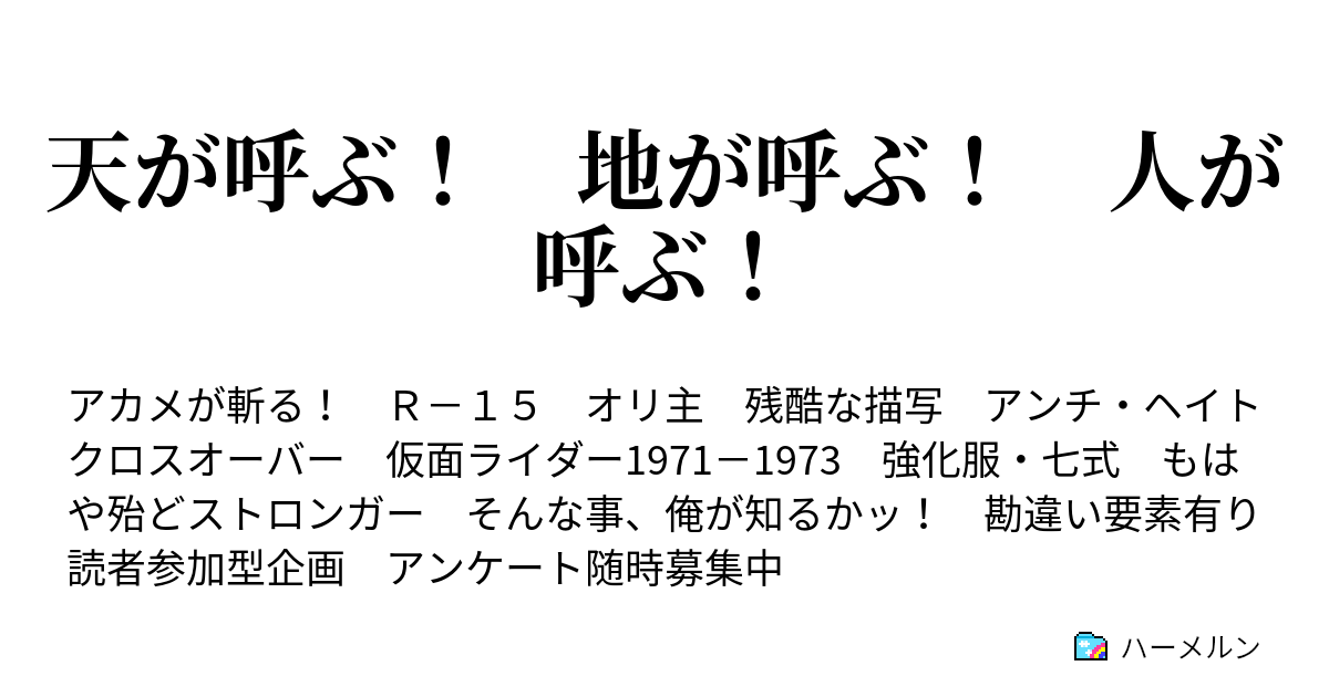 天が呼ぶ 地が呼ぶ 人を呼ぶ 俺を呼ぶ 悪を倒せと俺を呼ぶ 俺は正義の戦士 仮面ライダーストロンガー 全開ハードボイルドの結末は俺が決める