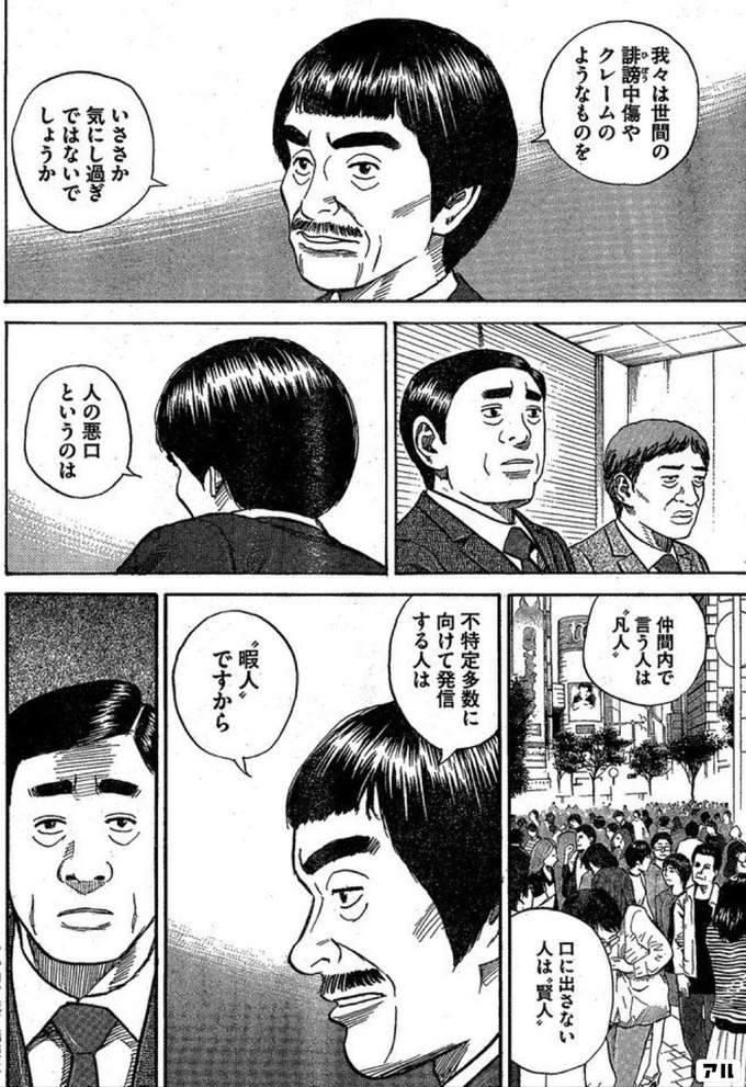 我々は 世間の誹謗中傷やクレームのようなものを いささか気にし過ぎではないでしょうか 人の悪口というのは 仲間内で言う人は 凡人 口に出さない人は 賢人 不特定多数に向けて発信する人は 暇人 ですから 宇宙兄弟 アル