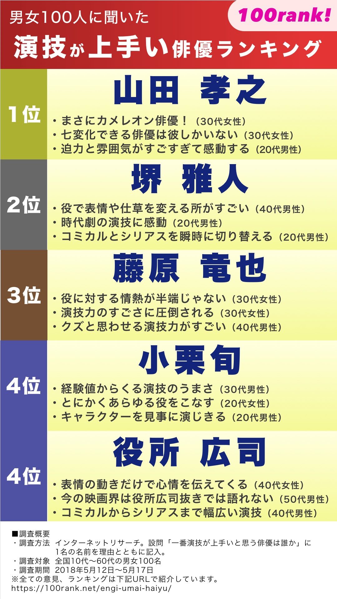 100rank 100人に聞くランキングメディア sur twitter 演技が上手い俳優ランキング 演技力no 1に輝いた俳優は top5をご紹介します 思わず息を呑む演技を見せる名優達に今後も大注目です すべてのランキングを見る場合は下記urlをご覧ください https t