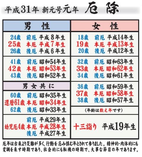 平成30年 2018 厄年表 厄除け厄払い祈願をする年齢 厄年早見表 30年 年表 平成