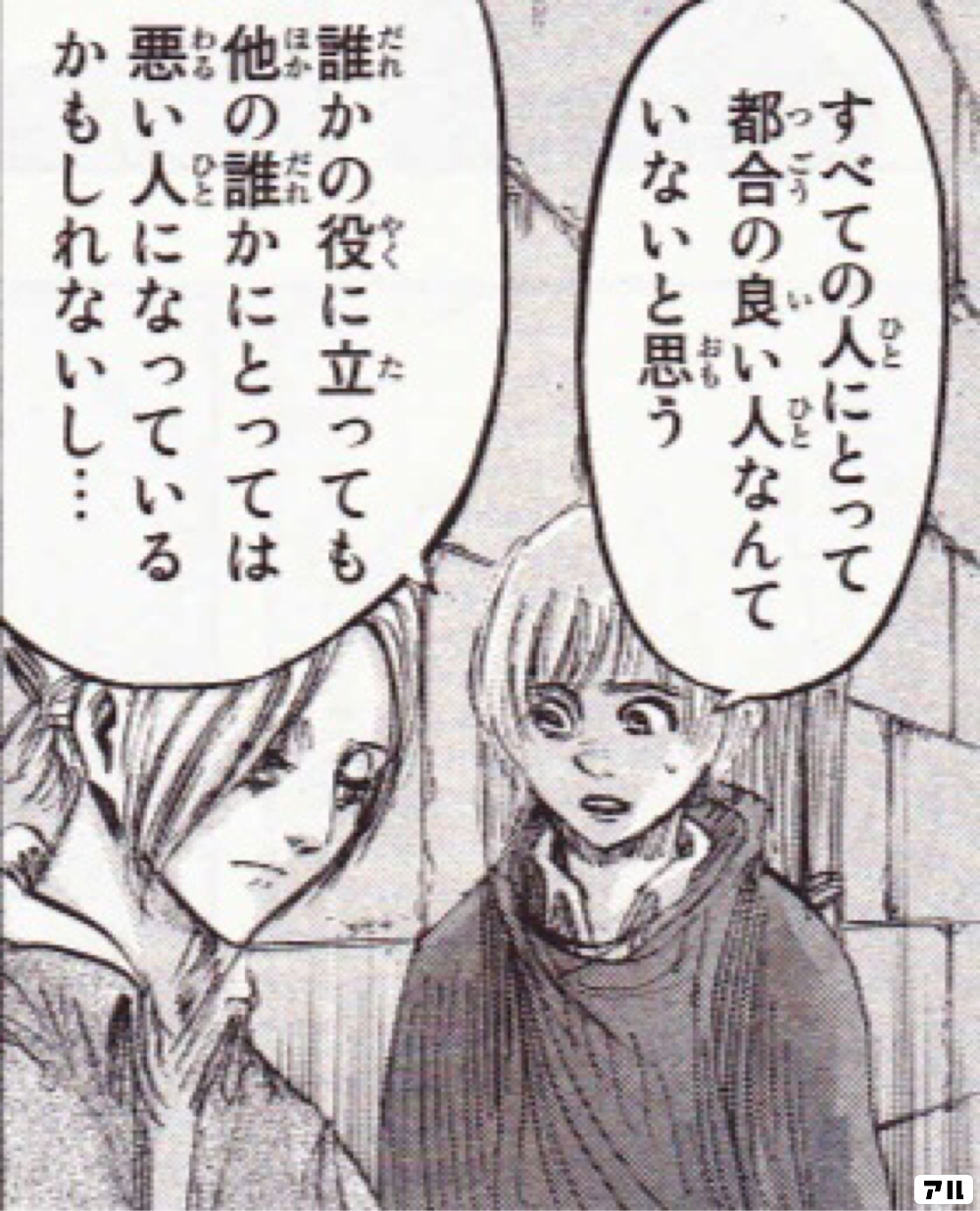 すべての人にとって 都合の良い人なんて いないと思う 誰かの役に立っても 他の誰かにとっては 悪い人になっているかもしれないし 進撃の巨人 アル