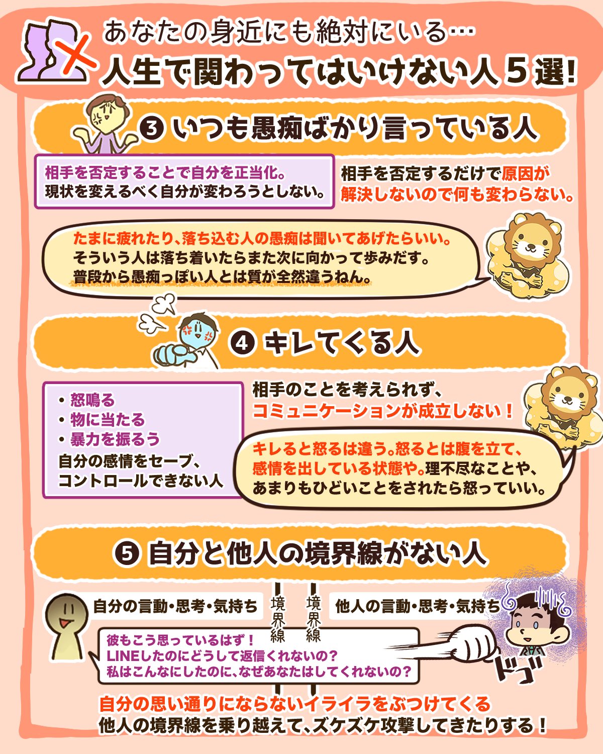 両 自由に生きるための知恵を配信中 リベ大学長 در توییتر 人生で関わってはいけない人ベスト5 マウントおじさん 正論バカ いつも愚痴ばかり言ってる人 キレてくる人 自分と他人の境界線がない人 これらの人と我慢して関わり続けると 自分がどんどん疲弊し